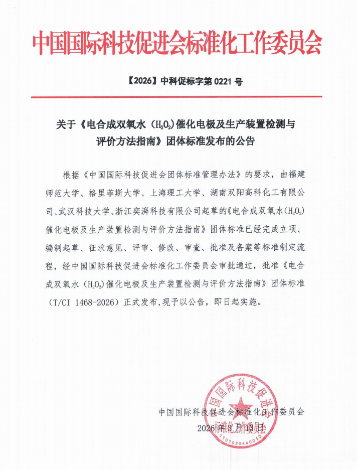 近日,由中国国际科技促进会归口管理的《电合成双氧水(H₂O₂)催化电极及生产装置检测与评价方法指南》团体标准(T/CI 1468-2026)正式发布并实施。