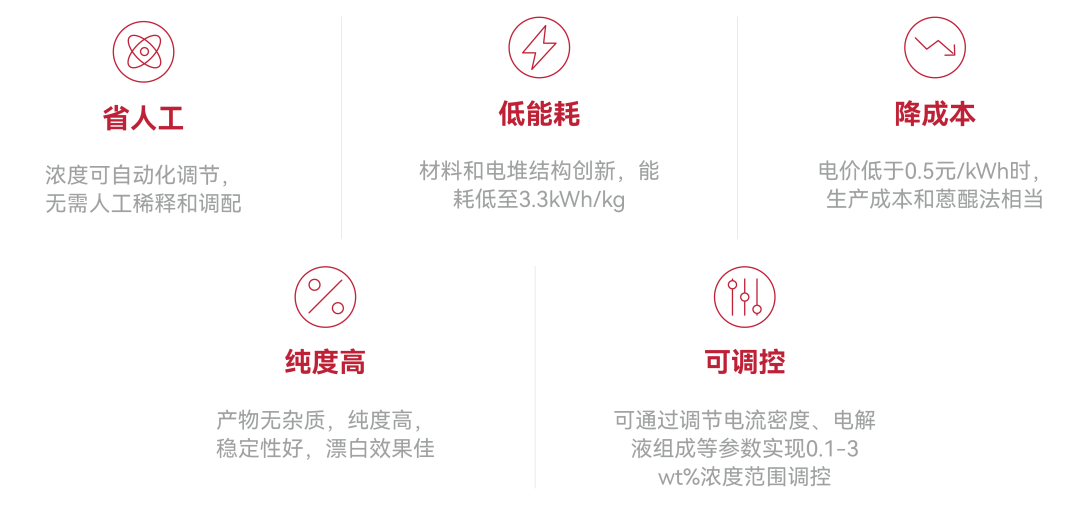 目前,公司自主开发的过氧化氢绿色电合成成套技术与装备已逐步推向市场,产品可广泛应用于造纸漂白、纺织漂白、工业水处理、新能源、家电清洁杀菌等领域。通过导入过氧化氢绿色电合成装备,助力客户实现安全生产、降低运营成本、优化生产工艺、构建核心竞争力。